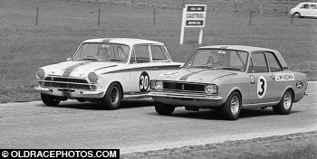 Jim McKeown Lotus Cortina Mk 2 rounds up Tony Calvert in his Mk 1 at Symmons 1969