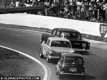Leon Pedzik 1956 Chev leads Cortina GT and Cooper S BP cnr Oran Park 1967. Fair quality only