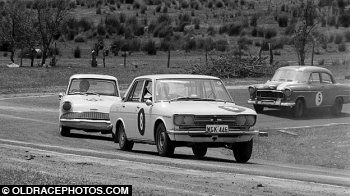 Ray Long Datsun 1600 leads Phil Brooke Anglia and Gil Hilyard FC Holden Baskerville 1968