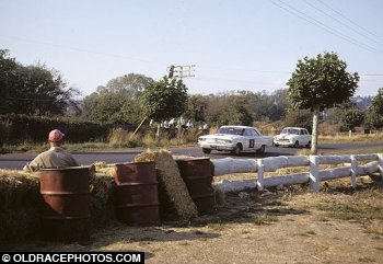 Sir Gawainne Baillie Ford Galaxie 7.0 leads Bob Jane Lotus Cortina into Pub cnr Longford 1965