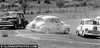 Roy Reeve spins in No 48 FX Holden (flat tyre) Greg Rumney nips thru the inside while Ed Conacher takes to the grass Baskerville 1969
