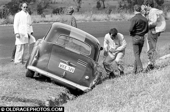 Ed Conacher FJ Holden lays in the ditch at the top of the straight at Baskerville after a spin 1969