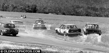 Garth Wigston Torana L34, Tony Jory XL Falcon and Steve Birtwhistle XU-1 all off the road at the Esses Baskerville 1974