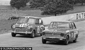 Dick Thurston AMI Racing Team Toyota Corolla leads Tony Watts Cooper S out of the hairpin at Symmons 1969