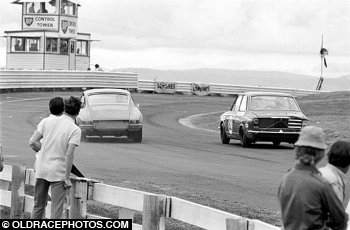 Alan Hamilton Porsche 911S rounds up Stephen Quon Toyota Corolla Symmons ATCC meeting 1969. Pretty sure this is the end of the day Touring car handicap race.