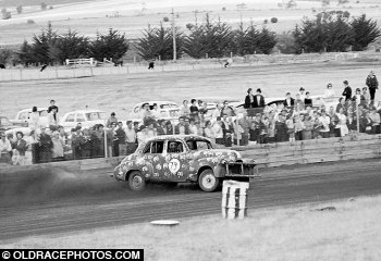 No 79 FJ Holden big slide at Richmond Speedway 1968. Note hand print paint job - very creative!