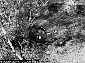 Bruno Carosi gets out of the ex Jane Jaguar Mk 2 after going off the road at the Viaduct Longford 1968
