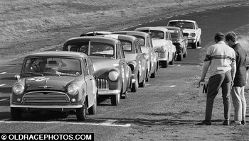 Touring Car handicap grid at the end of the day at Baskerville in 1968. Provided some great racing and incredibly close finishes on many occasions. Garth Wigston Cooper S and Wayne Quinn FX Holden at the front.