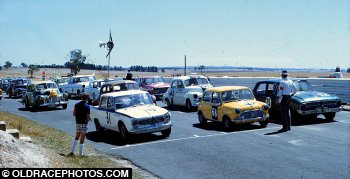 Symmons grid 1968. Peter Cazarro (or Gene Cook driving it), Graeme Scott Mini Cooper, Alan Roberts Falcon, Norm Gown FJ Holden behind him.