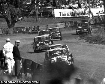 Paddy Hopkirk/Brian Foley, Damon Beck/Lakis Manticas, Charlie Smith/ Barry Seton Mini Cooper S line-up at McPhillamy Park 1967. Bill Burns/Chris Brauer Alfa Giulia at rear Fair quality only
