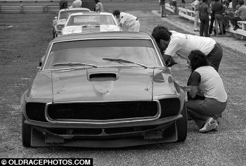 Allan Moffat Mustang pit lane Symmons 1972. Blanchard Camaro behind.