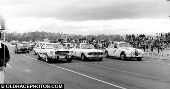 Longford grid 1967 - Ian Geoghegan Mustang, Frank Gardner Alfa GTA, Bruno Carosi ex Jane Jaguar Mk 2