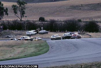 John Fidler FJ Holden S/sedan leads Stuart Salter HB Torana /6 cyl, Richard Purtell XU-1, Ken Loughran Corolla, Vince Powell (? maybe) Falcon V8 into the Esses Baskerville circa 1977