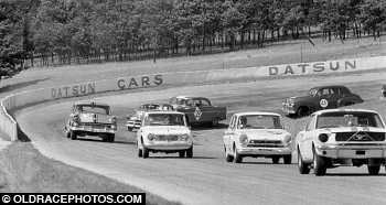 Robin Pare Mustang, Robin Bessant Lotus Cortina, Gene Cook in Peter Cazarro Alfa Ti (ex Businello Sandown 4hr winner), Roy Allford Customline, No 29 Customline is John Goss. Symmons 1967