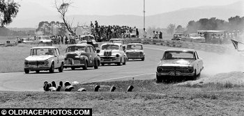 Alan Roberts XL Falcon takes a short cut while Peter Cazarro Alfa Ti, No 42 FX, Norm Gown FJ, Graeme Scott Mini Cooper line up for a conventional line Symmons 1968