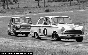 Tony Calvert ex Robin Bessant Lotus Cortina leads Bob Kent Morris Cooper S Baskerville 1968
