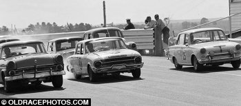 Neville Quinn Ford Customline, Rod Butler XL Falcon and Graham Parsons Cortina GT take off in the Div 2 tourer race. The Butler Falcon was interesting having a 6 Amal carb set up. Out of interest the Cusso had triple Strombergs.
