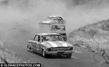 Colin Noble XL Falcon, Dick Thurston AMI Toyota Corolla , Tony Calvert Ford Mustang thru the cement dust at Calvins Cnr Baskerville 1970