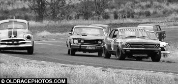 Div 2 Touring Car series Baskerville 1971. Michael Chung Torana XU-1 leads Trevor Fidler XW Falcon GT, Rick Depaoli FJ out wide, Tony Edmondson Cortina up the inside on the grass (!), maybe Phil Shepherd FX, then Colin Ransley Cortina GT at rear.