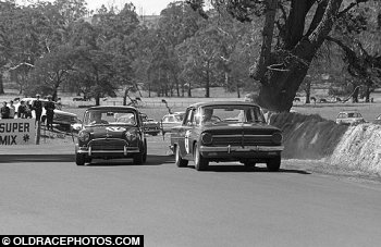 Tony Calvert EH Holden 179 leads Tony Watts Mini Cooper S 1293cc Mountford cnr 1968